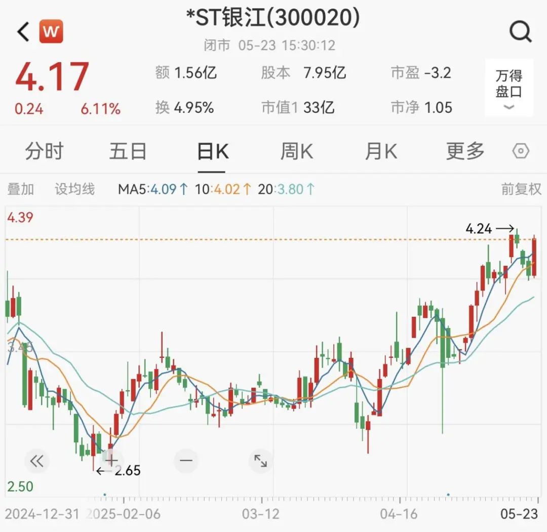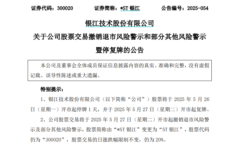 5月23日晚间,*ST银江发布公告称,公司股票交易将于2025年5月27日(星期二)开市起撤销退市风险警示及部分其他风险警示,股票简称由“*ST银江”变更为“ST银江”,股票代码仍为“300020”,股票交易的日涨跌幅限制不变,仍为20%。