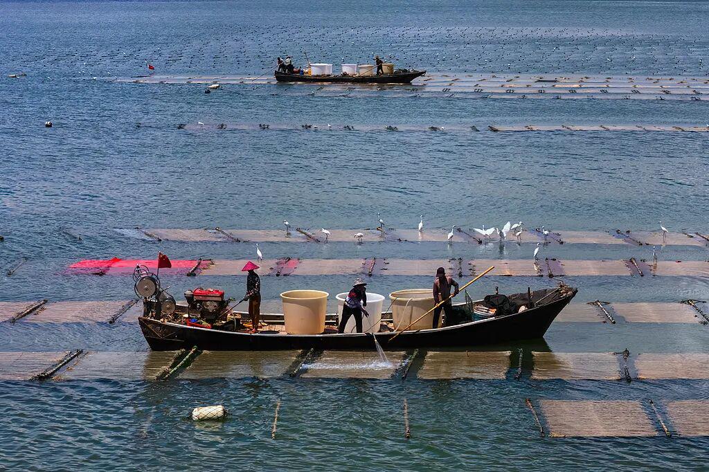 ▌海上养殖场,渔民伴着鹭影辛勤劳作 | ©视觉中国