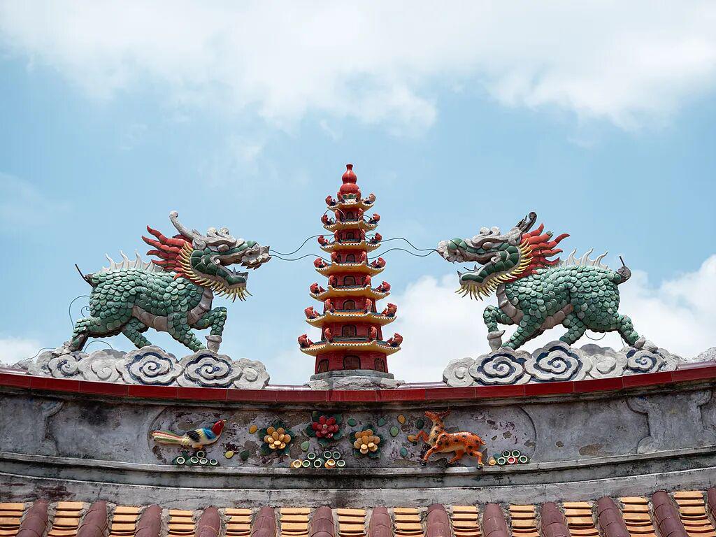 灵秀山的金相院是座会讲故事的番仔楼群落——南洋归来的华侨在1935年建成这座中西合璧的寺庙,最令人惊叹的是它建筑群落上精致的剪瓷造型,颜色鲜艳丰富,造型精致灵动,著名的滴水兽也制作得可细致看清层层鳞片,颇为精巧。