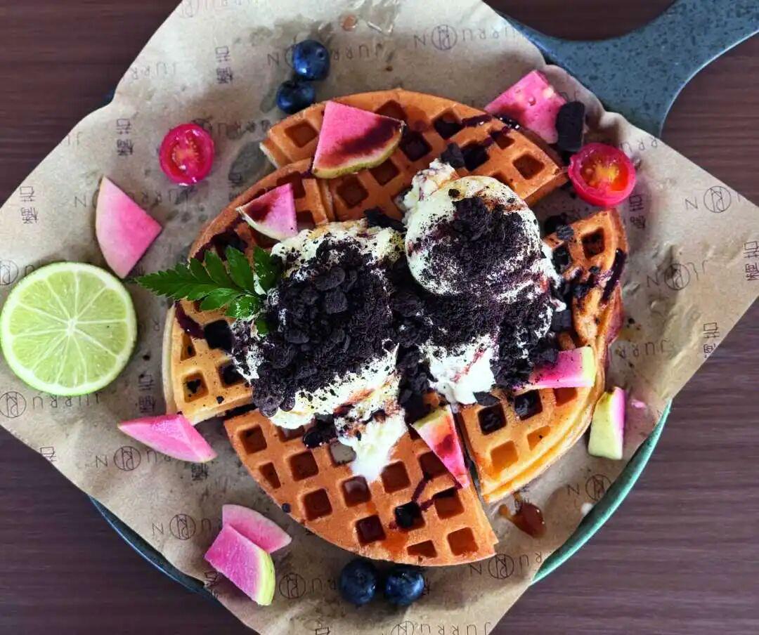 新鲜烘焙的华夫饼温度正好,奶油裹着马达加斯加香草籽,切开时能听见外皮轻裂的酥脆声响;特调的“荔枝蜜桃气泡饮”口味新鲜,正好应对海港灼热的天气;用海边的粗盐制作的焦糖海盐蛋糕仿佛还融着渔船归港时带回的海藻清香……