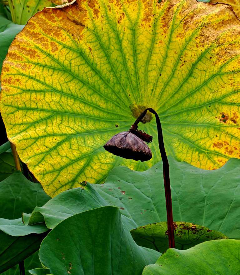 龙泽湖的秋色——初秋残荷之美,9月下旬至10月初,荷叶逐渐枯黄但依然挺立,与蜻蜓驻足、湖面倒映的秋色形成灵动画面。深秋五彩画卷