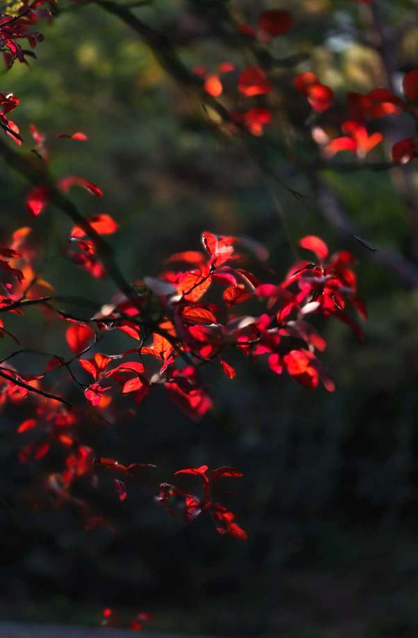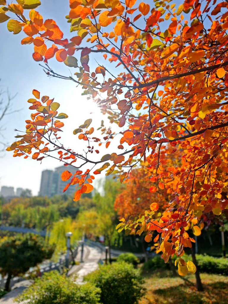 10月中旬至11月,黄栌树,紫叶李,银杏金黄、枫叶火红,湖面倒映出山峦、植被的绚丽色彩,呈现“橙黄橘绿“的诗意景象。